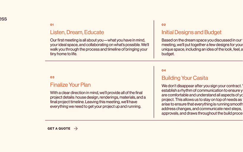 Their mission: make the process of adding an accessory dwelling unit feel as straightforward, dignified, and thoughtfully designed as the homes themselves. With no prior website in place, this was a ground-up build. Casita needed a digital foundation that could introduce the product, educate unfamiliar audiences, and create trust in a category that often feels opaque or overbuilt.