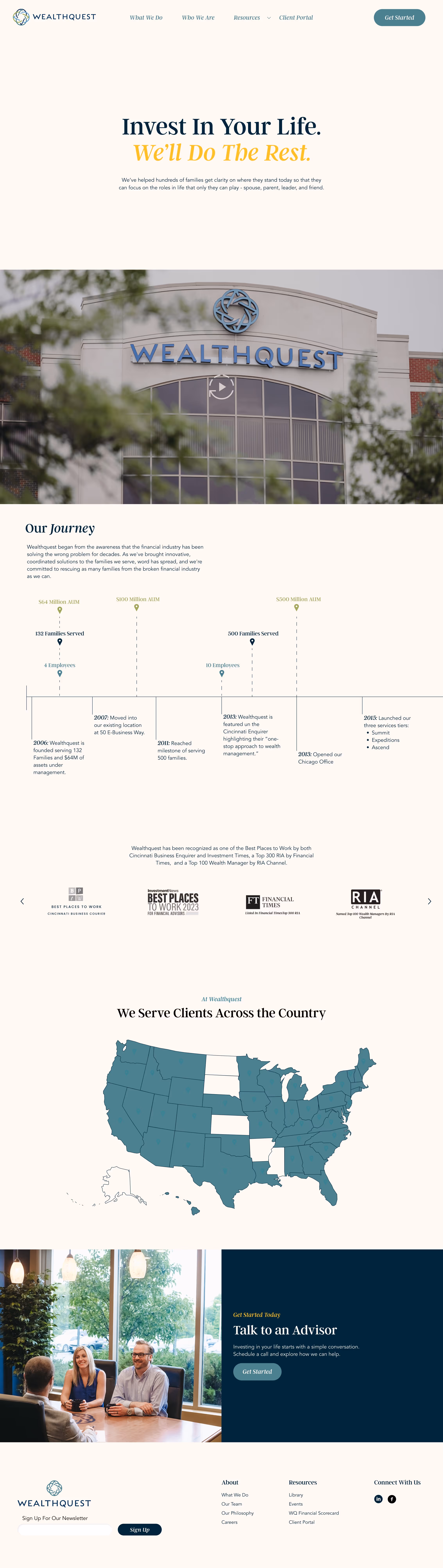 Wealthquest is a full-service wealth management firm that offers financial planning, tax, estate, and investment services—all under one roof, for one transparent fee. While many competitors specialize in just one vertical, Wealthquest’s strength lies in its integration: one team, one process, no handoffs— and we wanted their updated site to clearly showcase it.
